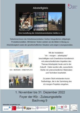 Mit den Ausstellungen Abstellgleis und ich-morgen-arbeitsplatz waren wir 2022 in der Kfz-Zulassungsstelle des Landkreis Gießen vertreten. Die Kombination dieser beiden Ausstellungen wurde hier zum ersten Mal gezeigt und verdeutlicht die verbindenden Aspekte beider Projekte. Abstellgleis zeigt Fotos stillgelegter Betriebsstätten und setzt sie mit kurzen Texten in Bezug zur Situation der Erwerbslosigkeit. Ich-morgen-arbeitsplatz besteht aus 15 umgestalteten Stühlen, die verschiedene Aspekte des Themas Arbeit beleuchten.
